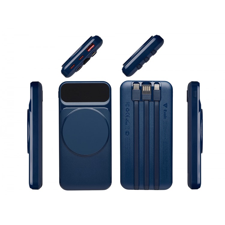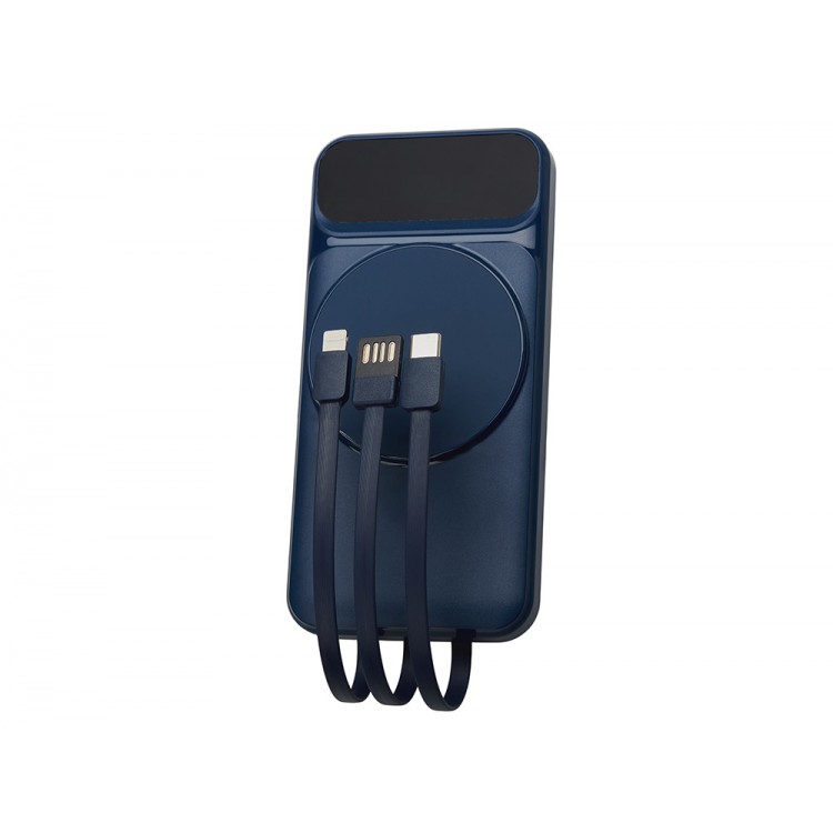 Магнитный беспроводной внешний аккумулятор со встроенными кабелями Мэни,быстаря зарядка, 10000 мАч, тёмно-синий