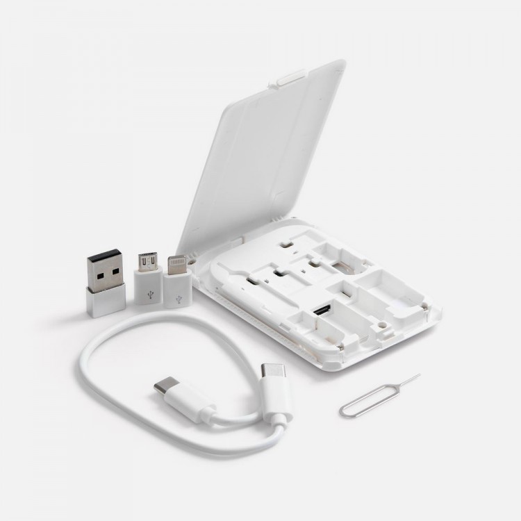 Octopod — компактная станция для беспроводной зарядки, которая укомплектована ключом для слота SIM-карты, кабелем с разъемами USB Type-C-Type-C, переходниками на разъемы lightning, USB Type-A и micro USB.