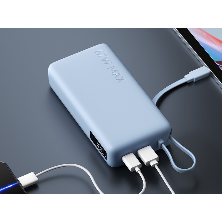 Пауэрбанк поддерживает быструю двустороннюю зарядку до 67 Вт через встроенный кабель, а также имеет дополнительный USB‑C и USB‑A порт — это позволяет быстро заряжать смартфоны, планшеты, ноутбуки и другие устройства.