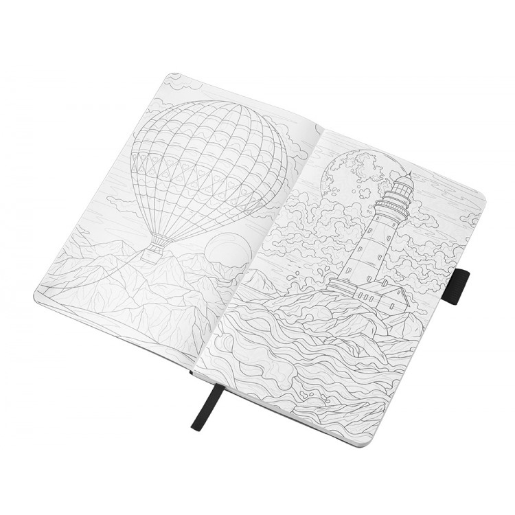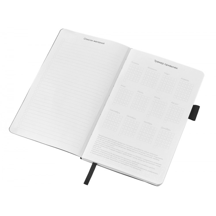 Необычный для блокнота вводный блок включает трекер привычек, списки книг и фильмов, а также 4 страницы для раскрашивания с картинками и мандалами.