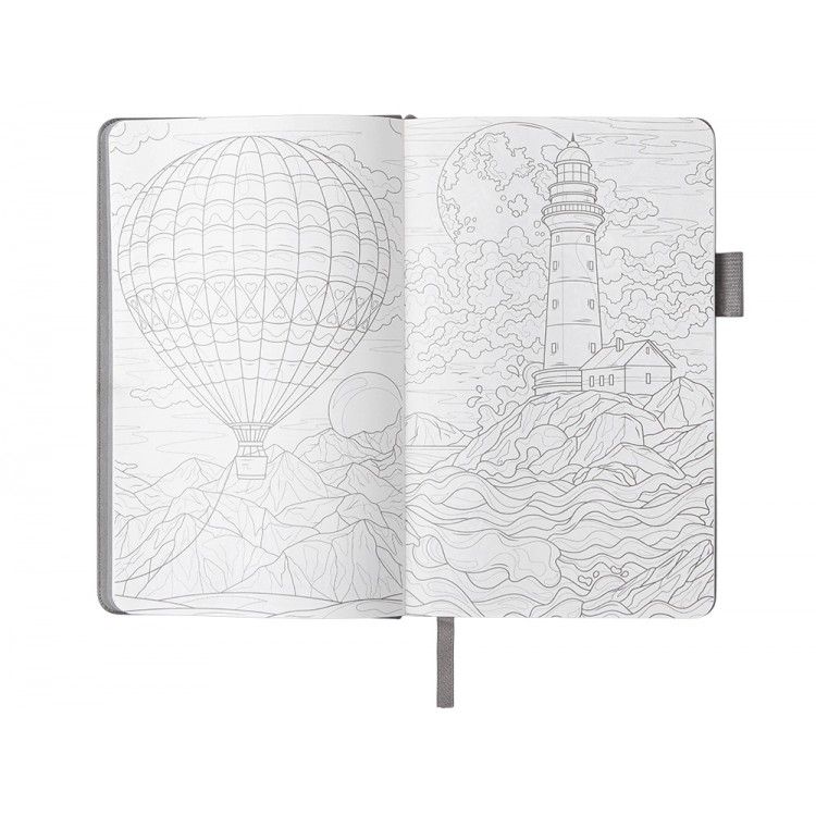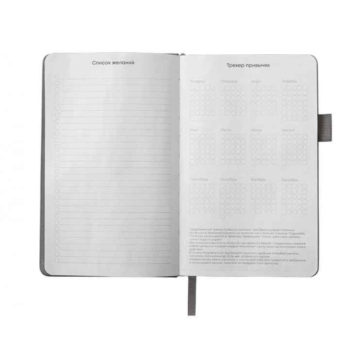 Необычный для блокнота вводный блок включает трекер привычек, списки книг и фильмов, а также 4 страницы для раскрашивания с картинками и мандалами.