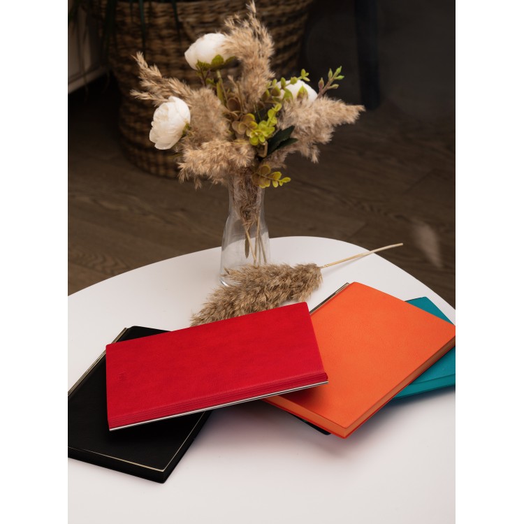 Притягивает внимание, офисные принадлежности и желание что-нибудь срочно записать. Минималистичный в оформлении ежедневник «Аскона» представлен в ярких насыщенных цветах с цветным срезом. Гибкая обложка имеет фактуру натуральной кожи, её дополняет металлическая планка корешка. Блок из плотной тонированной бумаги в 256 страниц удобно использовать с чёрной лентой-ляссе в цвет среза ежедневника.