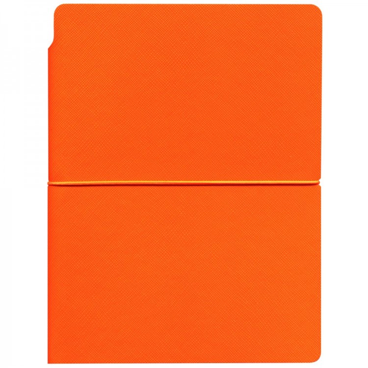 Ежедневник с гибкой обложкой выполнена из материала Nice Touch, оранжевый и Latte, оранжевый (внутренняя часть обложки), дополнен горизонтальной резинкой в цвет обложки. Внутри корешка — специальное место для крепления ручки размером до 15х1 см.