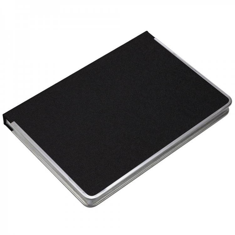 Ежедневник с твердой обложкой и серебристым обрезом, выполнен из материала Saffian, черный, дополнен серым ляссе и металлическими рамками.
