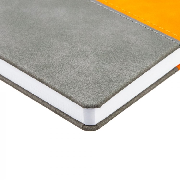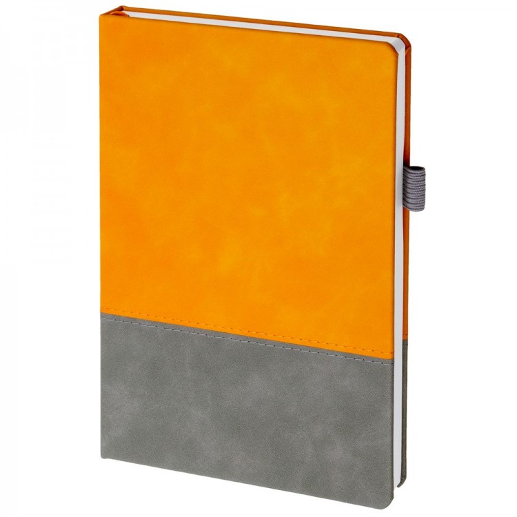 Ежедневник с твердой обложкой, без поролона, со сшивкой материалов Nubuck Touch, серый СС, и Nubuck Touch оранжевый ОО, дополнен двойным ляссе и петлей-резинкой для ручки.
