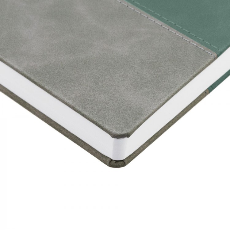 Ежедневник с твердой обложкой, без поролона, со сшивкой материалов Nubuck Touch, серый СС, и Nubuck Touch зеленый FF, дополнен двойным ляссе и петлей-резинкой для ручки.