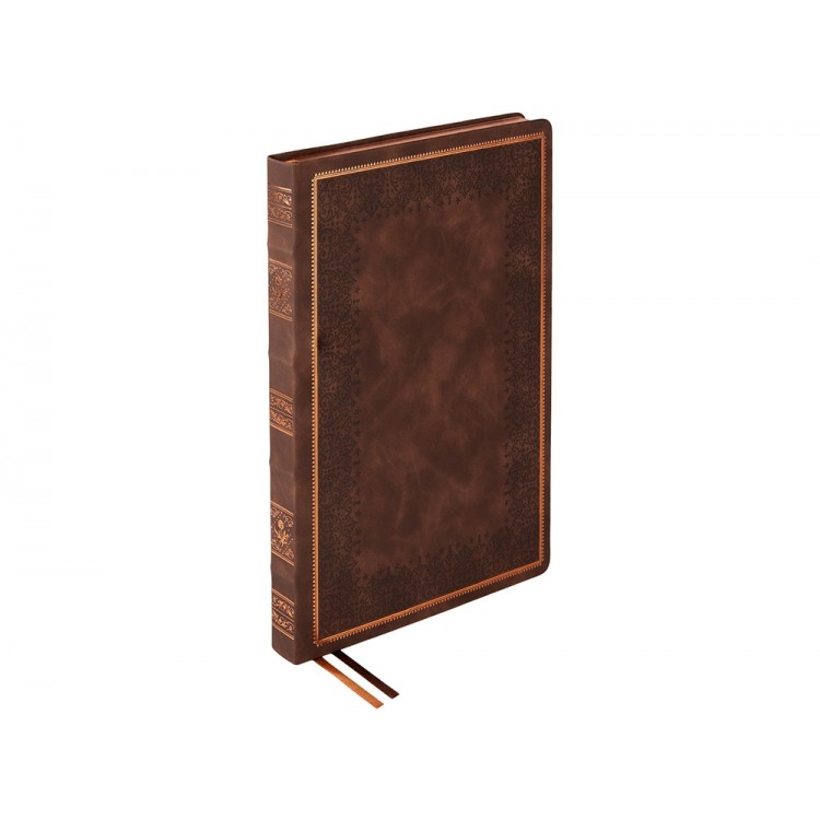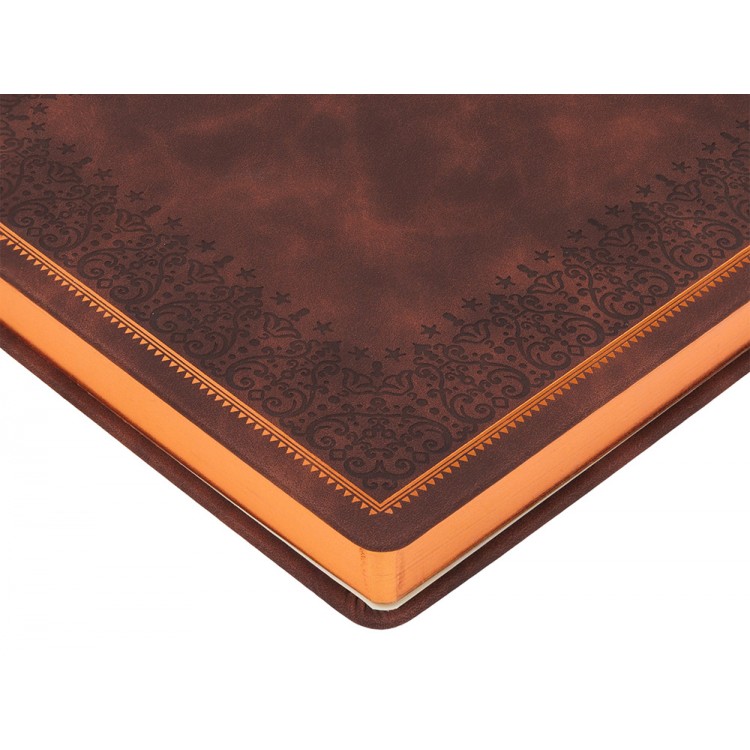 Недатированный ежедневник Royal формата А4 с твердой обложкой из искусственной кожи с имитацией нубука украшен художественным бронзовым и блинтовым тиснением. Внутри 192 страницы, выполненные из качественной бежевой бумаги в линейку плотностью 140 г/м². Два шелковых ляссе в цвет обреза блока и обложки облегчают навигацию по записям. Французский корешок дополнительно декорирован изящным бронзовым тиснением в виде виньеток. Скругленные углы обложки и блока подчеркивают стильный дизайн изделия, а блеск бронзового обреза дарит ежедневнику благородный и роскошный внешний вид.