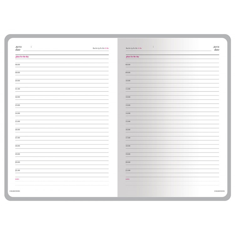 Недатированные страницы в серую линейку имеют отдельное место для проставления числа месяца и дня недели. Справочный блок на 14 страницах содержит полезную информацию из различных областей.