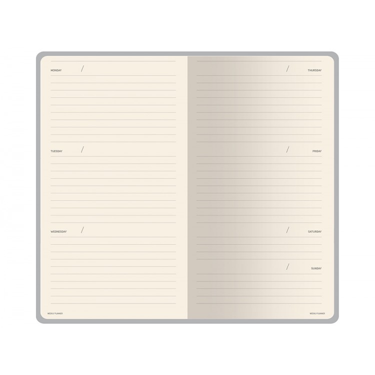 Внутри — недатированный блок формата А6 (84×160 мм) на бежевой бумаге 80 г/м². Книжный переплёт хорошо раскрывается, а скруглённые углы одновременно придают еженедельнику премиальный вид и защищают края при носке. Ляссе‑закладка выполнена в цвет обложки и помогает быстро находить нужную страницу.