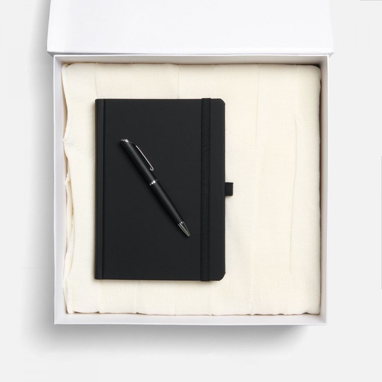 Однотонный набор с основной канцелярией и пледом — классика жанра в уютном исполнении. С компактным ежедневинком будет удобно делать заметки в любое время — благодаря петельке для ручки любимый пишущий инструмент будет всегда под рукой. А изысканный акриловый плед с геометрическим узором позволит выразить самые теплые пожелания и ддобавит плавных линий в интерьер.
