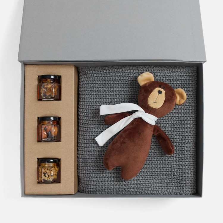 Милый мишка в шарфике с целой коллекцией разнообразного ароматного меда идеально дополняет основной, более практичный подарок — объемный шарф из толстой пряжи, который впишется в любой зимний образ.
