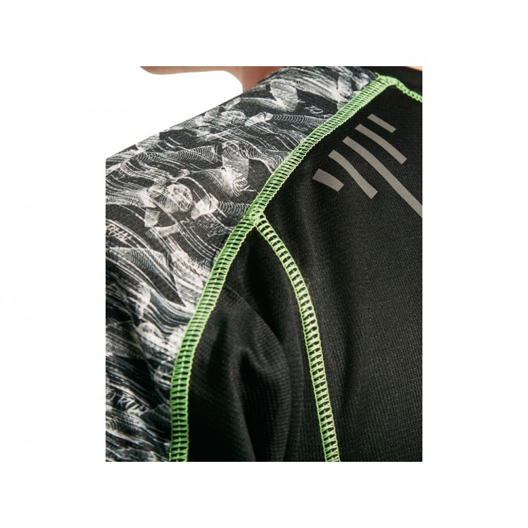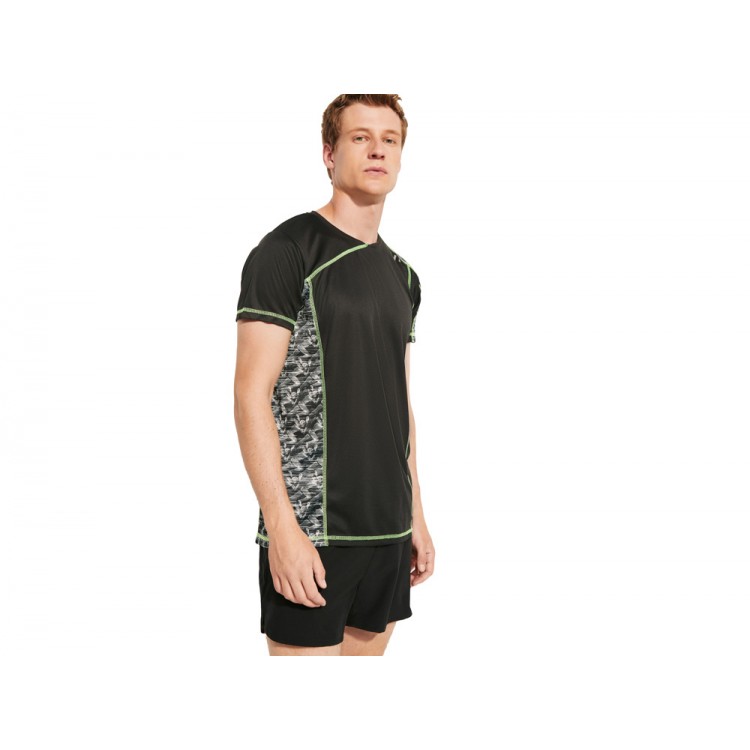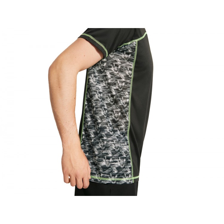 Спортивная футболка с коротким рукавом и принтованными вставками. Контрастные отстрочки плоским швом, светоотражающие элементы на полочке и спинке. Эко лейбл на рукаве.