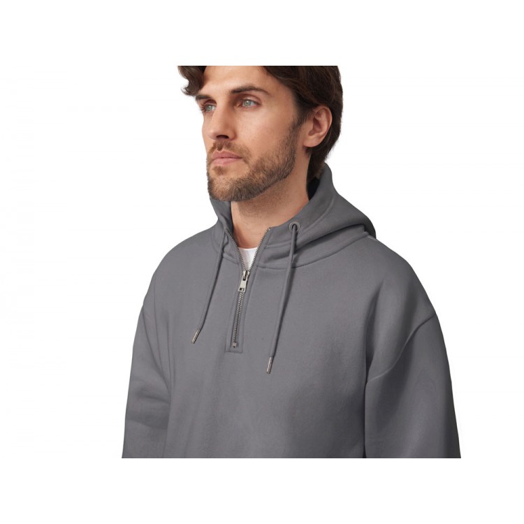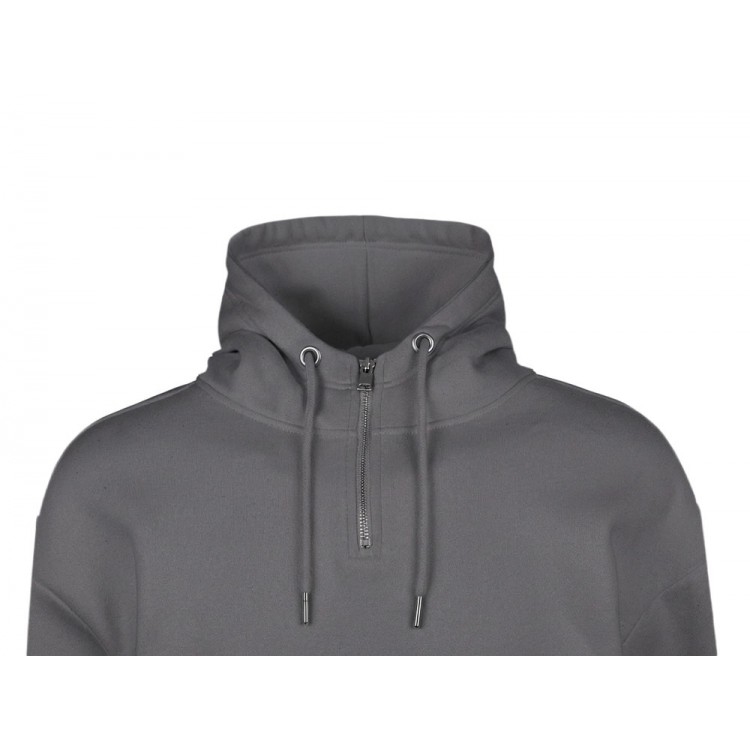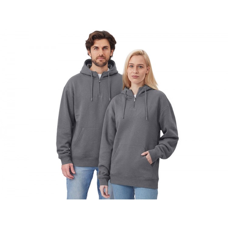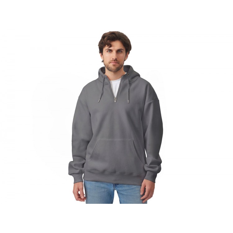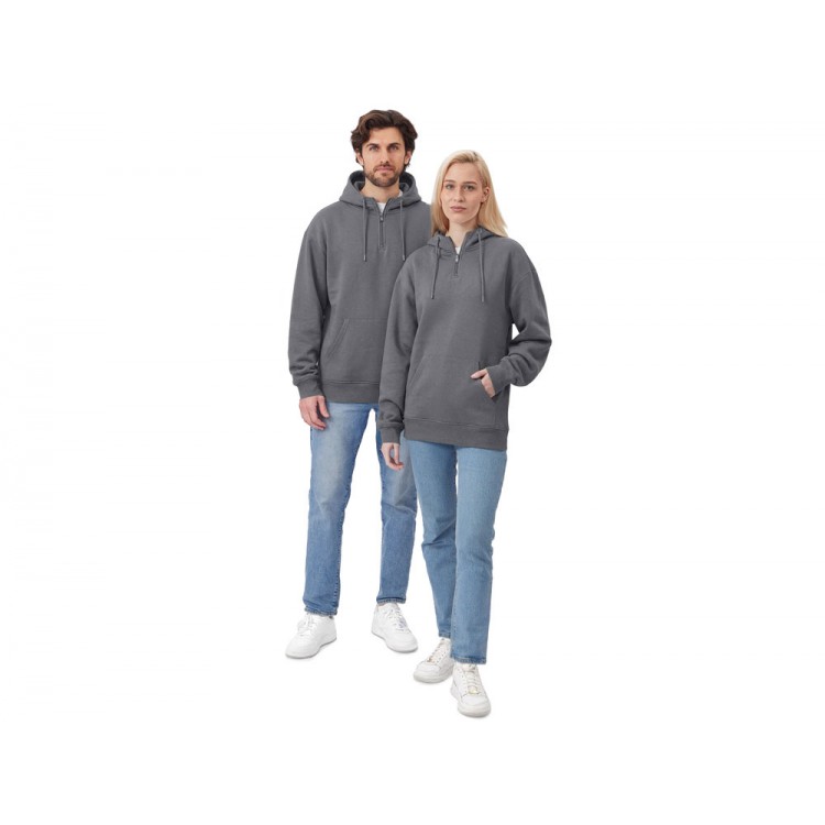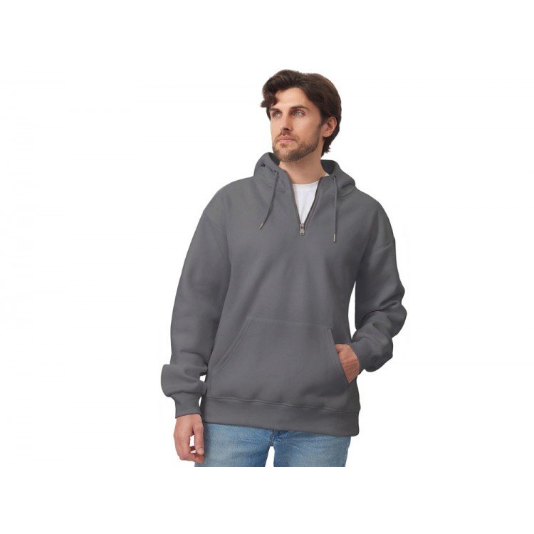 Худи с капюшоном ворот на молнии. Шнур в капюшоне с металлическими наконечниками. Отделка горловины спинки внутри тесьмой, Риб 2х2 по низу изделия и манжетам. Удобный карман кенгуру.