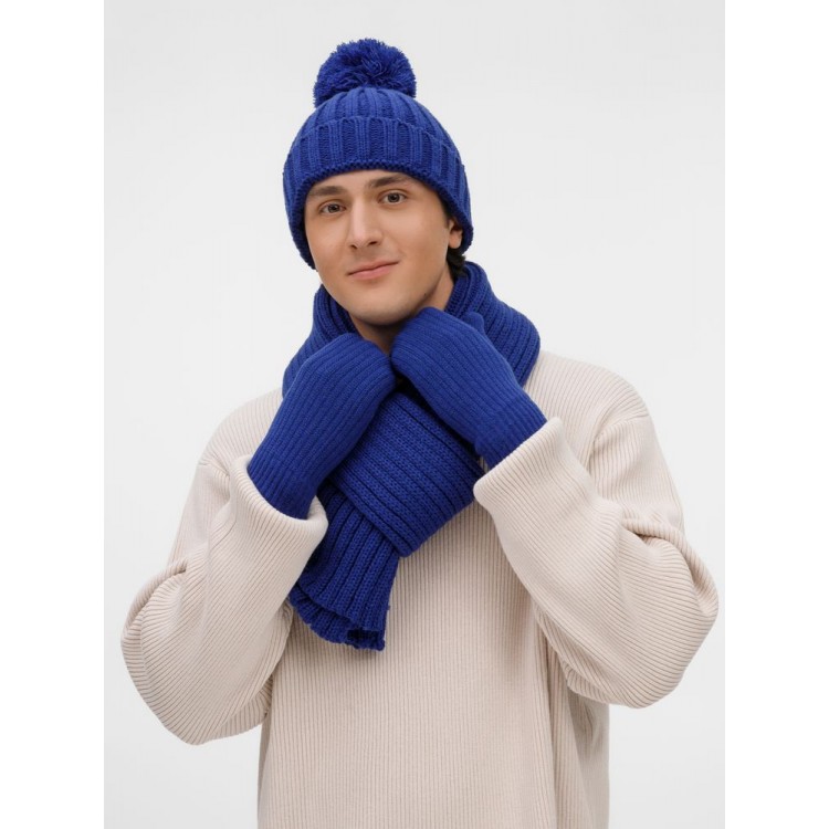 Шапка с пышным помпоном и отворотом, связанная крупной резинкой создает игривый силуэт, а широкий шарф с выразительной текстурой надежно защищает от ветра, сохраняя свободу движений. Варежки с отворотом-резинкой плотно облегают запястье, не пропуская холод.