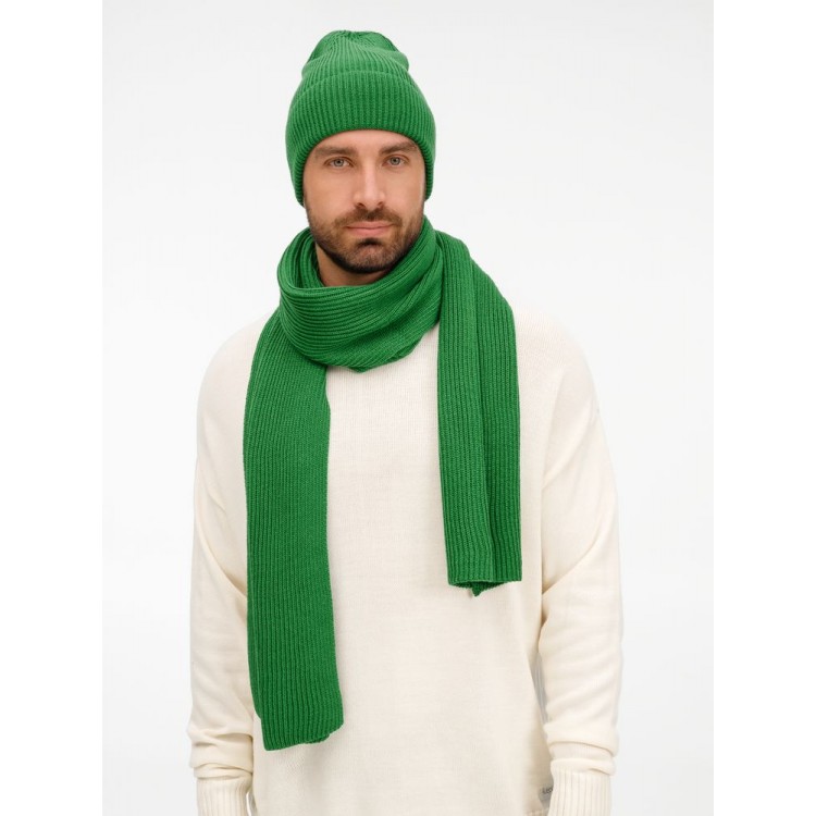 Удлиненная шапка с широким отворотом и фактурной вязкой мягко облегает голову, создавая элегантный силуэт. Широкий шарф с выразительным рельефом позволяет экспериментировать с драпировками, добавляя образу объем и динамику. Перчатки с аккуратной резинкой на манжете обеспечивают идеальную посадку и тактильный комфорт.