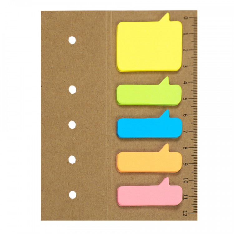 Удобный в использование набор со стикирами в обложке из крафтового картона. Размер: 130 x 55 x 11 мм. В блокноте 5 цветов закладок с клеевым краем. По 25 закладок каждого цвета. Внутри нанесена линейка в сантиметрах.