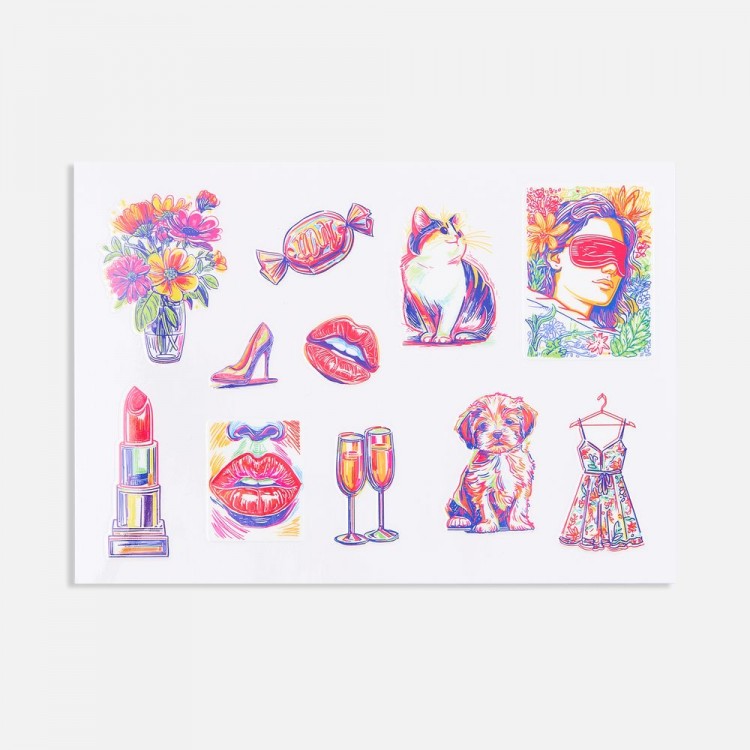 Тематические UV-DTF наклейки Thematik — яркие, красочные и слегка объемные наклейки с гладкой глянцевой поверхностью. Это удобный способ персонализировать любимые аксессуары: клеящий слой надежно удерживает наклейку на пластике, металле, керамике, коже, ПВХ, покрытии софт-тач и других поверхностях.