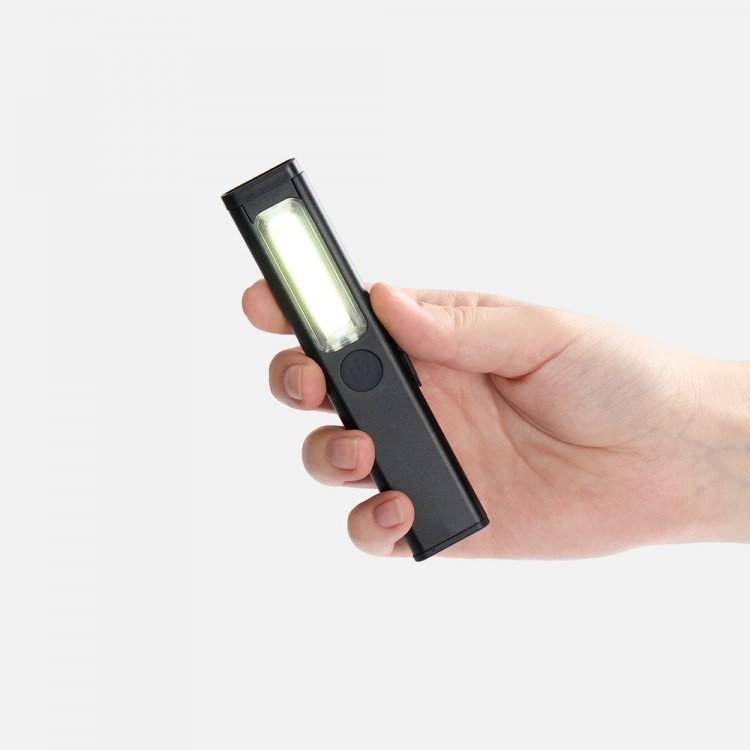 Плавная регулировка яркости осуществляется удержанием центральной кнопки при включенном устройстве — это позволяет точно адаптировать освещение под рабочие условия. Магнит в основании фонарика дает возможность зафиксировать фонарик на металлической поверхности и освободить руки для выполнения задач.