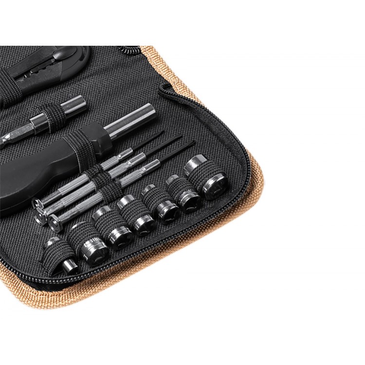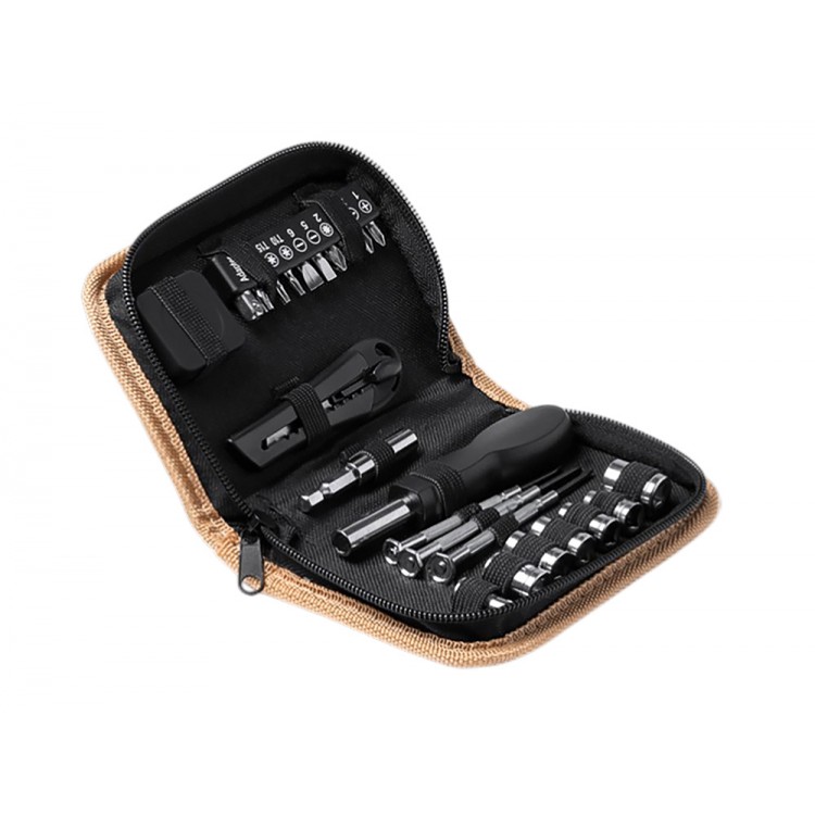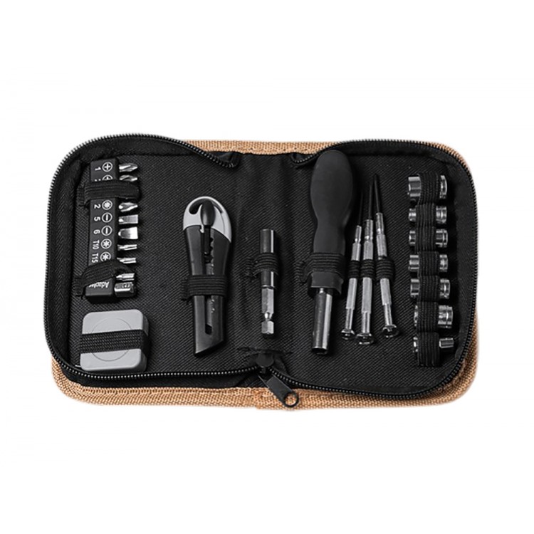 Набор инструментов из 25 аксессуаров. Канцелярский нож, шестигранные ключи, звездчатые и плоские отвертки, отвертка под разные насадки и рулетка 100 см. Набор поставляется в пробковом футляре.