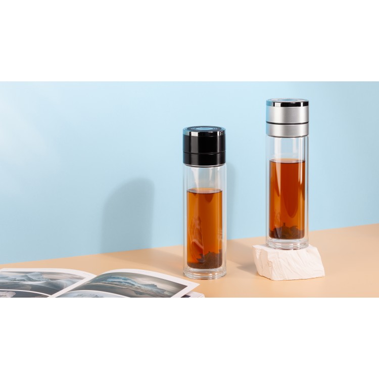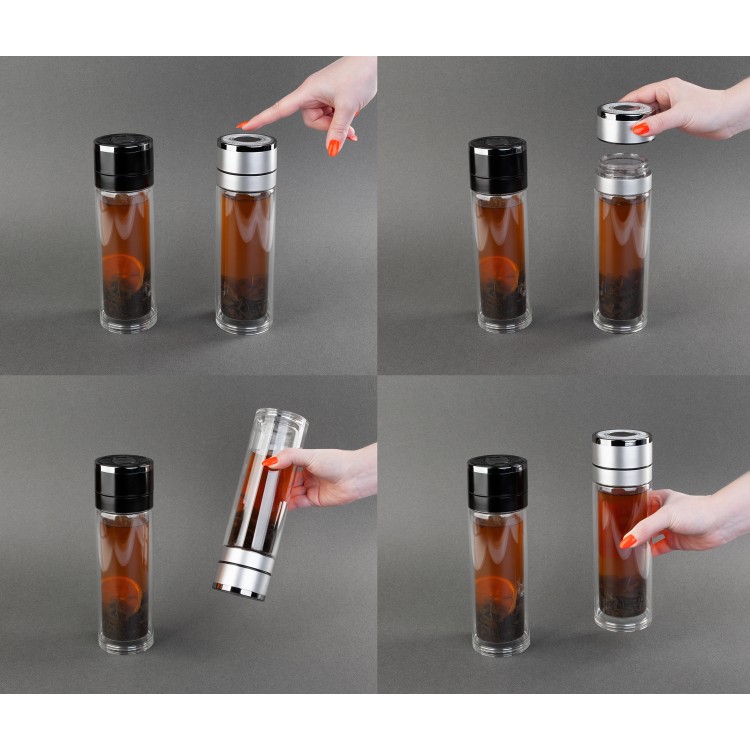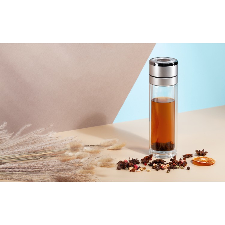 Заварочный термос "Press" 400 мл с удобной крышкой, которая открывается нажатием кнопки, для закрытия достаточно слегка надавить на нее до щелчка. Сито из 304 стали для фильтрации содержимого. Двустенная колба из боросиликатного стекла идеально подходит для горячих напитков, внешняя стенка не нагревается, комфортно держать в руках. Стекло не имеет посторонних запахов, напитки сохраняют вкус.