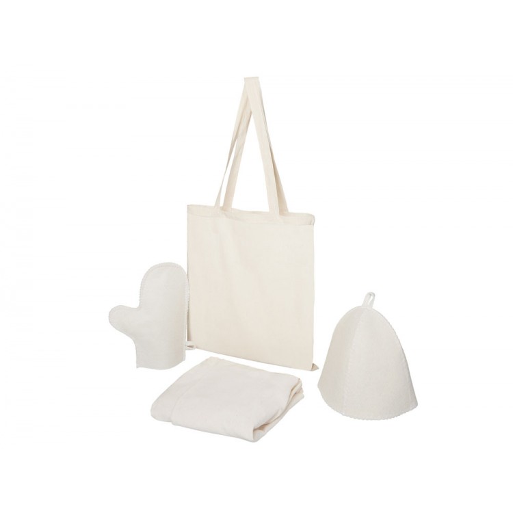 Создайте уют в парной: женский холщовый килт, шапка и рукавица — всё необходимое для отдыха, аккуратно сложено в хлопковый шоппер.