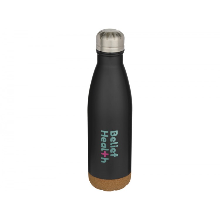 Бутылка для воды из нержавеющей стали с вакуумной изоляцией и пробковыми деталями в нижней части. Двойная изоляция стенок сохраняет напитки горячими или холодными в течение нескольких часов. Поставляется в подарочной коробке из переработанного картона. Объем: 500 мл. 90% нержавеющая сталь, 10% Пробка. упаковка FSC Mix Credit P5.1 CU-COC-877277.