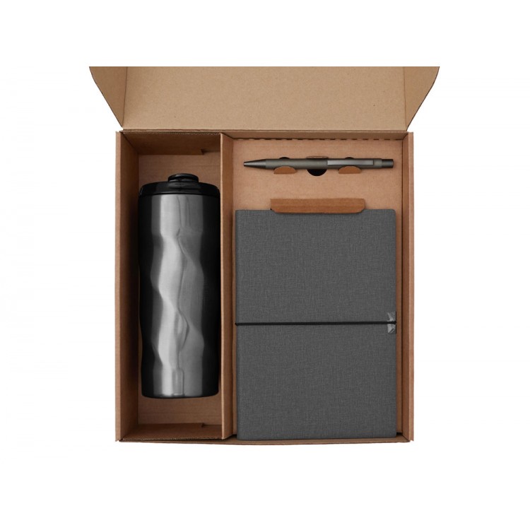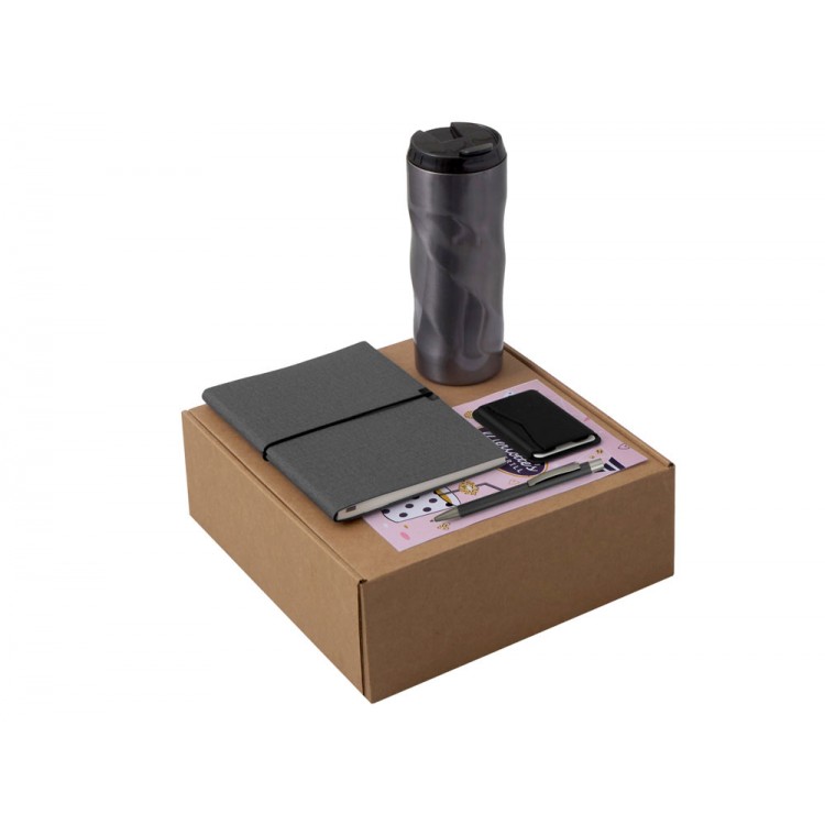 блокнот- искусственная кожа, бумага, ручка - металл с поверхностью soft-touch, термокружка - кружка- нержавеющая сталь, крышка- пластик, картхолдер - переработанный полиуретан, открытка - бумага, коробка- картон