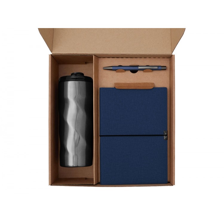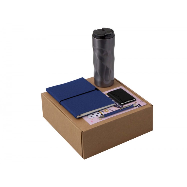 блокнот- искусственная кожа, бумага, ручка - металл с поверхностью soft-touch, термокружка - кружка- нержавеющая сталь, крышка- пластик, картхолдер - переработанный полиуретан, открытка - бумага, коробка- картон