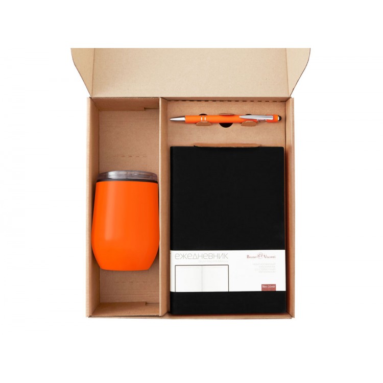 ежедневник - искусственная кожа, термокружка - нержавеющая сталь снаружи, полипропилен внутри, ручка - металл c покрытием soft-touch, ситечко - нержавеющая cталь