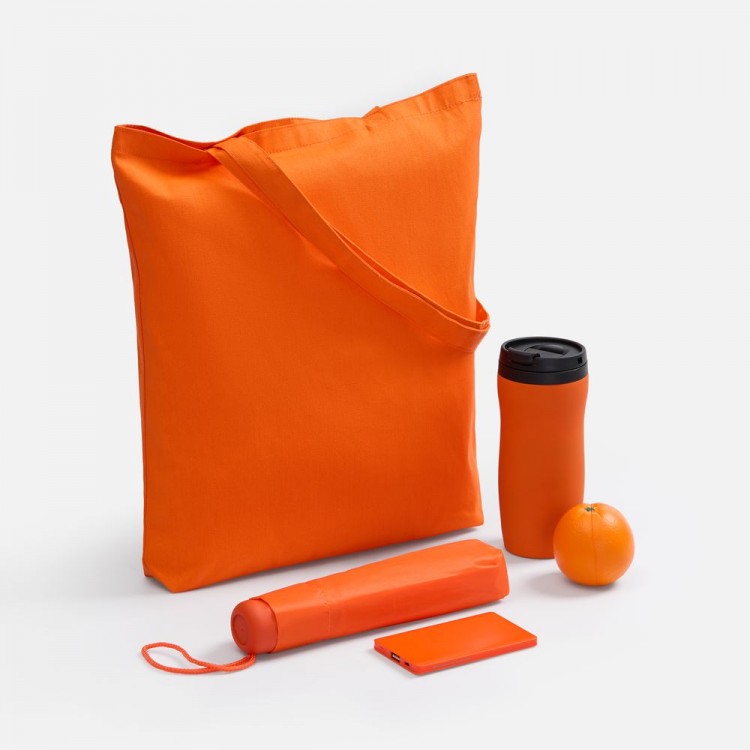 зонт - полиэстер 190T, ручка - пластик; покрытие софт-тач; каркас, спицы - металл; аккумулятор - пластик; крышка термостакана, внутренняя колба - пластик, корпус - нержавеющая сталь; покрытие софт-тач; сумка - хлопок 100%, плотность 210 г/м²; антистресс - вспененный полиуретан