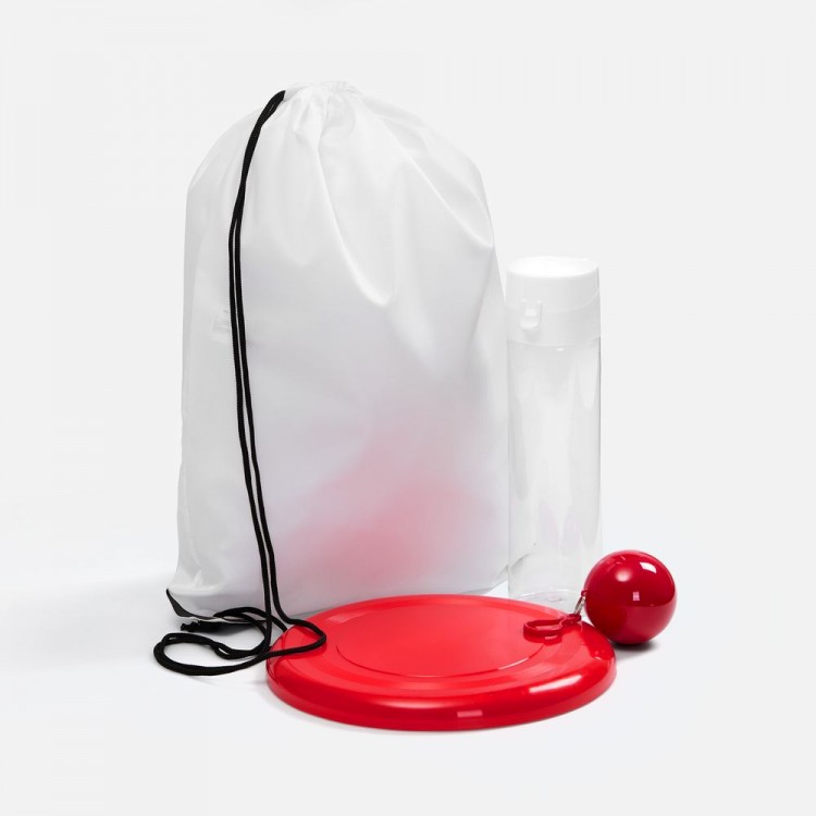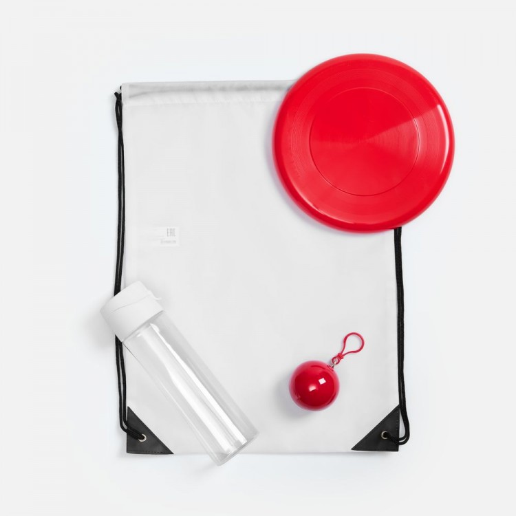 бутылка, футляр, тарелка-фрисби - пластик; плащ - полиэтилен, ПНД, плотность 12 мкм; рюкзак-мешок - спанбонд, плотность 70 г/м²