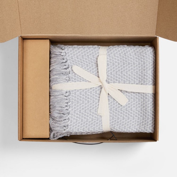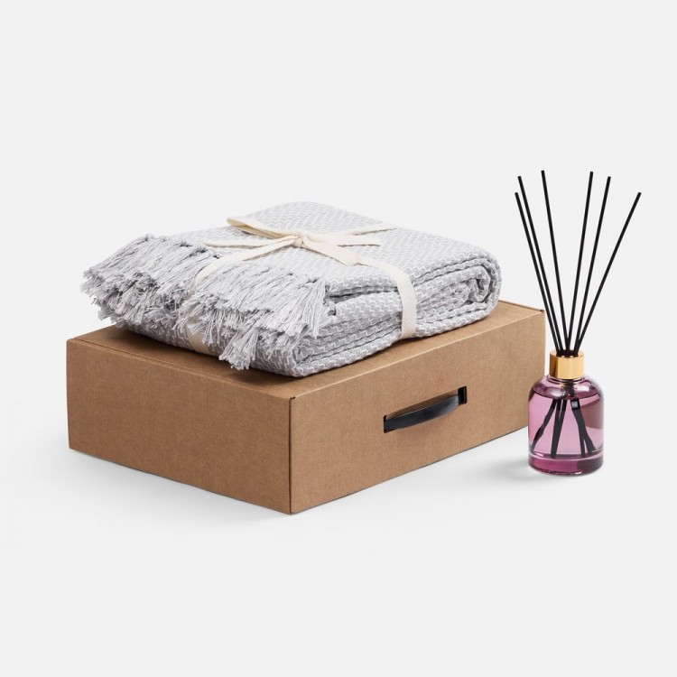 плед - хлопок 80%, полиэстер 20%, плотность 260 г/м²; флакон - стекло, палочки из файбера; коробка - микрогофрокартон