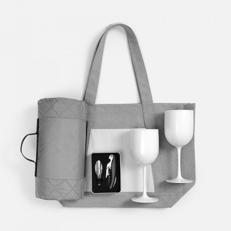 плед - флис, плотность 220 г/м²; полиэстер; шопер - полиэстер 60%, переработанный хлопок 40%, плотность 340 г/м²; набор для вина - нержавеющая сталь, пластик; бокалы - пластик