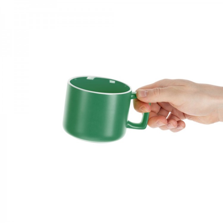 Глазурь спокойных оттенков, матовая снаружи и глянцевая внутри, графичная прямоугольная ручка — с чашкой Fusion не захочется расставаться.