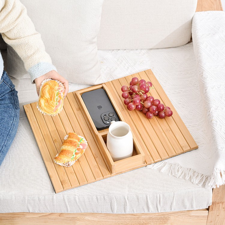 Благодаря реечной конструкции, органайзер можно легко разместить на кресле или диване. Нескользящее основание обеспечивает дополнительную фиксацию на различных поверхностях. Бамбук хорошо смотрится в любом интерьере. "Tray" идеально подходит как для дома, так и для офиса.