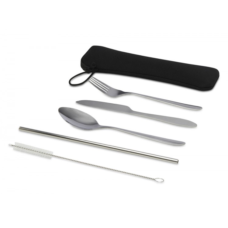 Набор столовых приборов Sheen включает вилку, нож, ложку, многоразовую соломинку и щёточку для её очистки. Все элементы выполнены из прочной и легко моющейся нержавеющей стали. Комплект удобно хранить и переносить в прочном чехле из неопрена с удобной петлей.