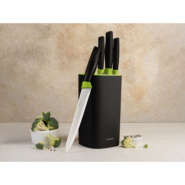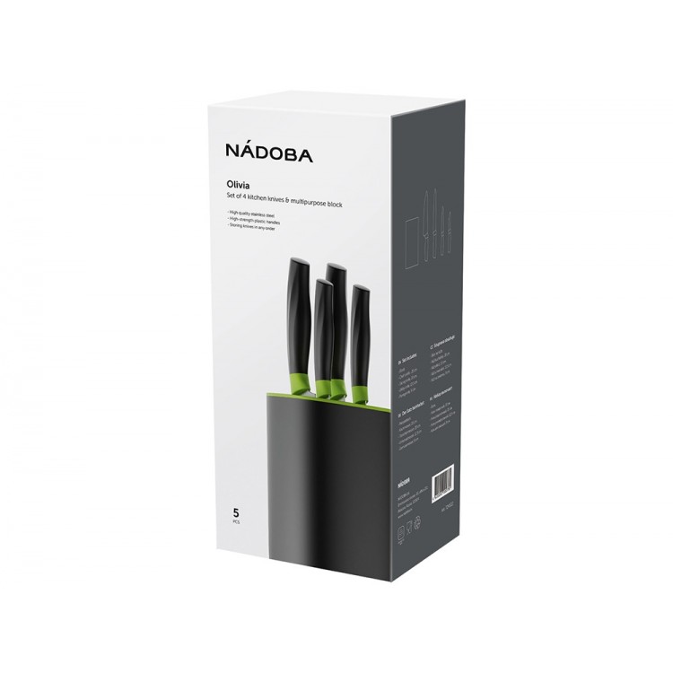 Набор ножей 5 предметов NADOBA серии Olivia состоит из: нож овощной, 9 см, нож универсальный, 12,5 см, нож разделочный, 20 см, нож поварской, 20 см и универсального блока для хранения ножей.