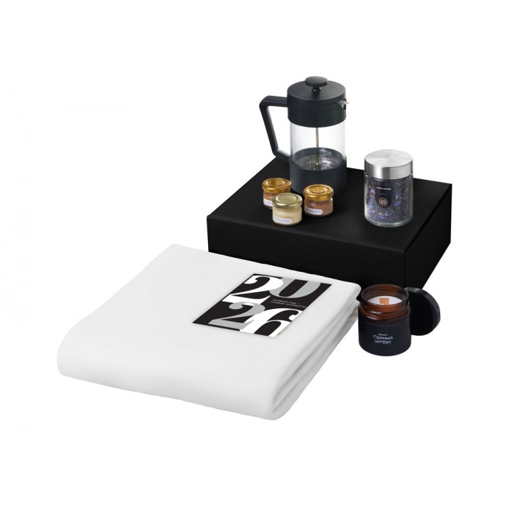 - Код товара: Подарочный набор c пледом, френчпрессом, чаем и медом, белый