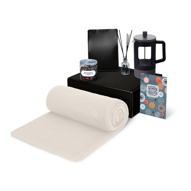 плед - флис, полиэстер, кофе - пластик, френч-пресс - нержавеющая сталь, боросиликатное стекло, ПП пластик, диффузор - стекло, миндаль - пластик, мешок - нетканый материал (спанбонд), коробка - картон