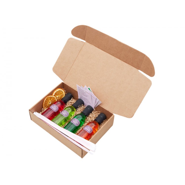- 4 бутылочки сиропов по 100 мл с яркими вкусами: Лайм, Маракуйя, Мята, Гренадин – классика коктейльного бармена.