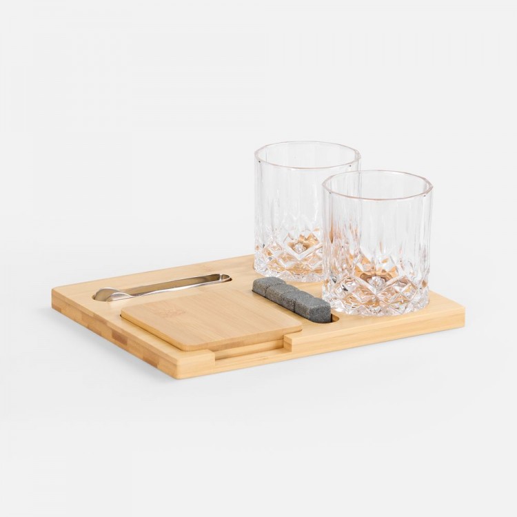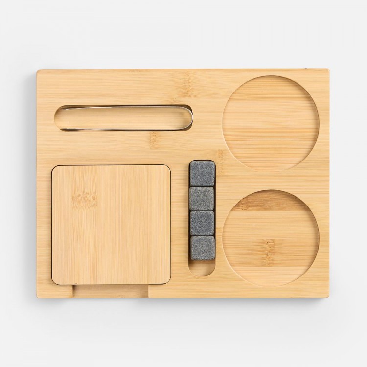 Полный арсенал для дегустации любимых сортов включает два элегантных стакана, костеры из натурального бамбука для безупречной подачи, камни для охлаждения без потери глубины вкуса и удобные щипцы для их использования.