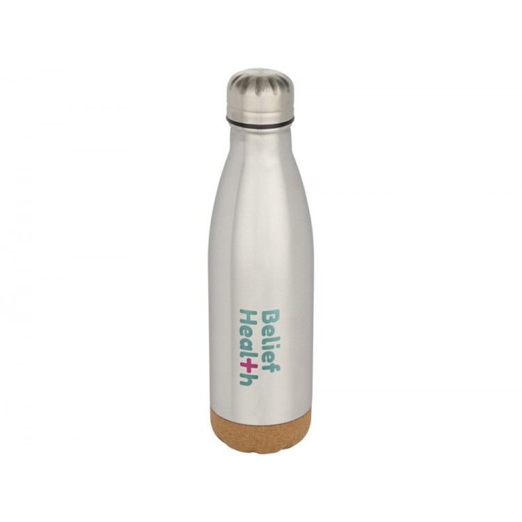 Бутылка для воды из нержавеющей стали с вакуумной изоляцией и пробковыми деталями в нижней части. Двойная изоляция стенок сохраняет напитки горячими или холодными в течение нескольких часов. Поставляется в подарочной коробке из переработанного картона. Объем: 500 мл. 90% нержавеющая сталь, 10% Пробка. упаковка FSC Mix Credit P5.1 CU-COC-877277.