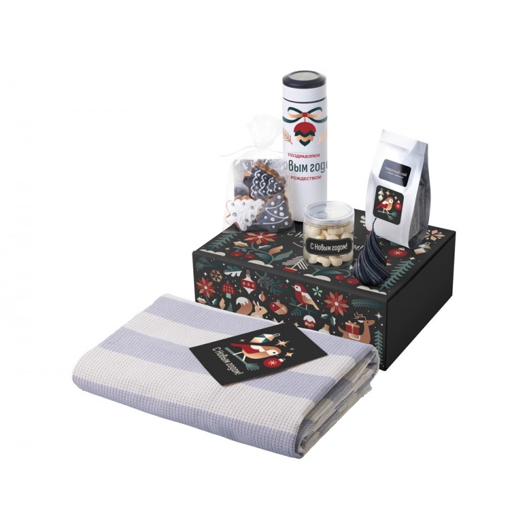 плед - 100% хлопок, мешок - нетканый материал (спанбонд), термос - нержавеющая cталь с покрытием soft-touch, открытка - бумага