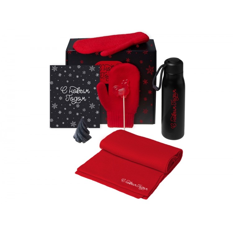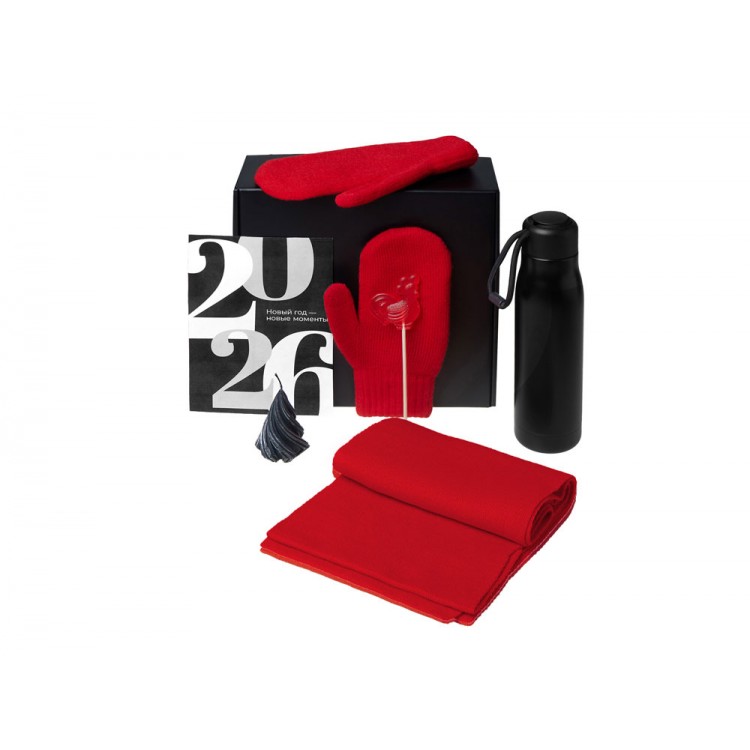 Подарочный набор с варежками, шарфом и термосом,красный