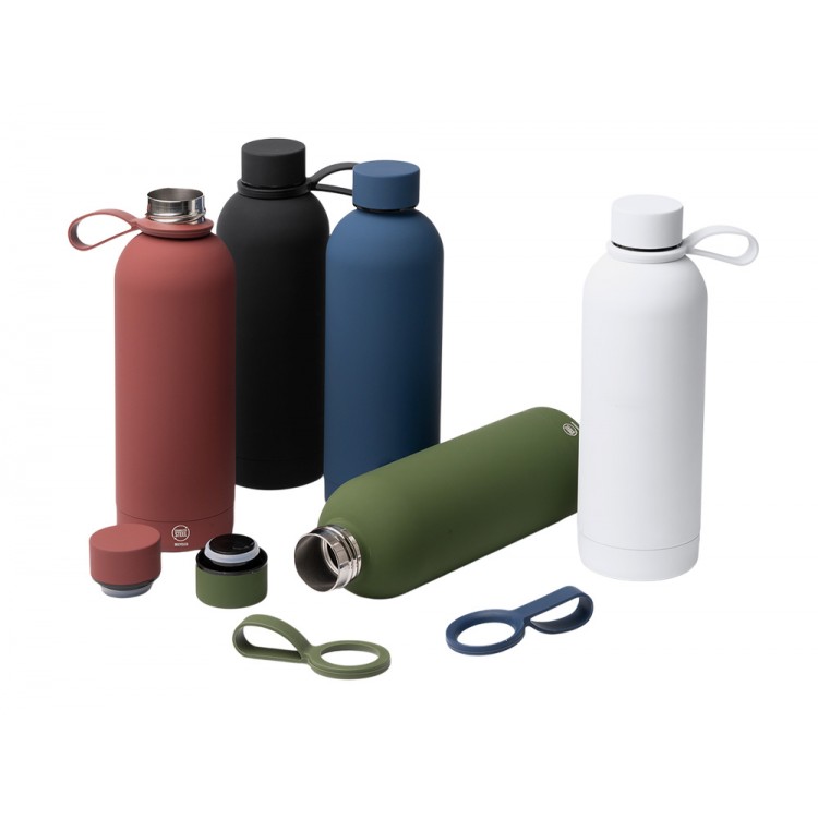 Термобутылка из переработанной нержавеющей стали 304. Мягкая прорезиненная поверхность на корпусе. Удобная силиконовая ручка для переноски. Оснащена противокапельной системой благодаря силиконовому кольцу, встроенному во внутреннюю часть крышки. Крышка и ручка соответствуют цвету корпуса. Объем: 500 мл.