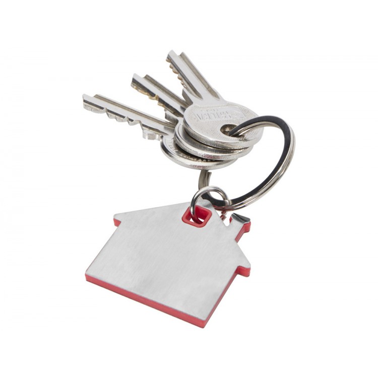 Брелок для ключей в форме домика с цветной вставкой из пластика между 2-мя серебристыми пластинами из стали.