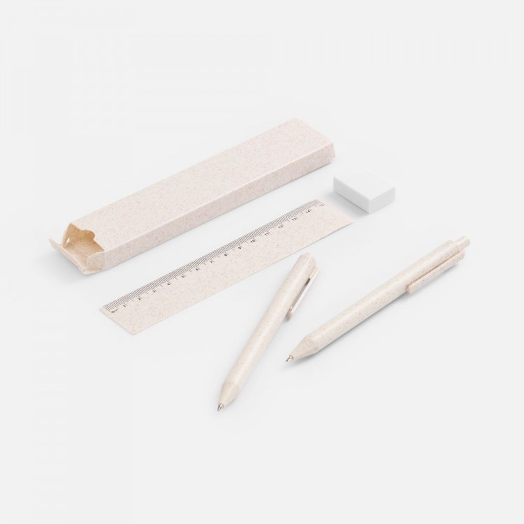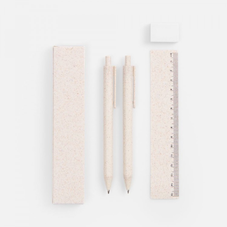 - В комплекте ручка, механический карандаш, линейка, ластик и упаковка.