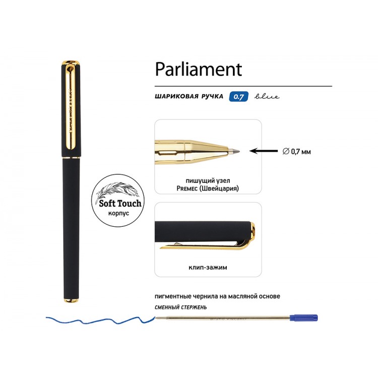 Ручка Parliament с чернилами на масляной основе синего цвета отличается мягким письмом и толщиной линии 0,5 мм. Ее прорезиненный корпус soft-touch обеспечивает комфорт при длительном использовании, а отвинчивающийся наконечник облегчает доступ к сменному стержню. Колпачок с клип-зажимом обеспечивает удобное крепление ручки на одежде или сумке. Качество письма обеспечивается премиальным швейцарским пишущим узлом диаметром 0,7 мм от производителя Premec и немецкими чернилами марки Dokumental. Ручка упакована в индивидуальную подарочную упаковку.