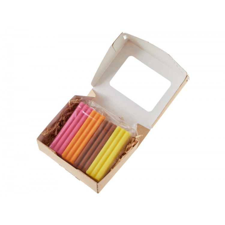Яркие и необычные конфеты в форме, напоминающей пластилин, создают праздничное настроение и радуют глаз. Изготовлены из качественных ингредиентов. В каждом наборе — 4 ярких вкуса: банан, апельсин, малина и солёная карамель!