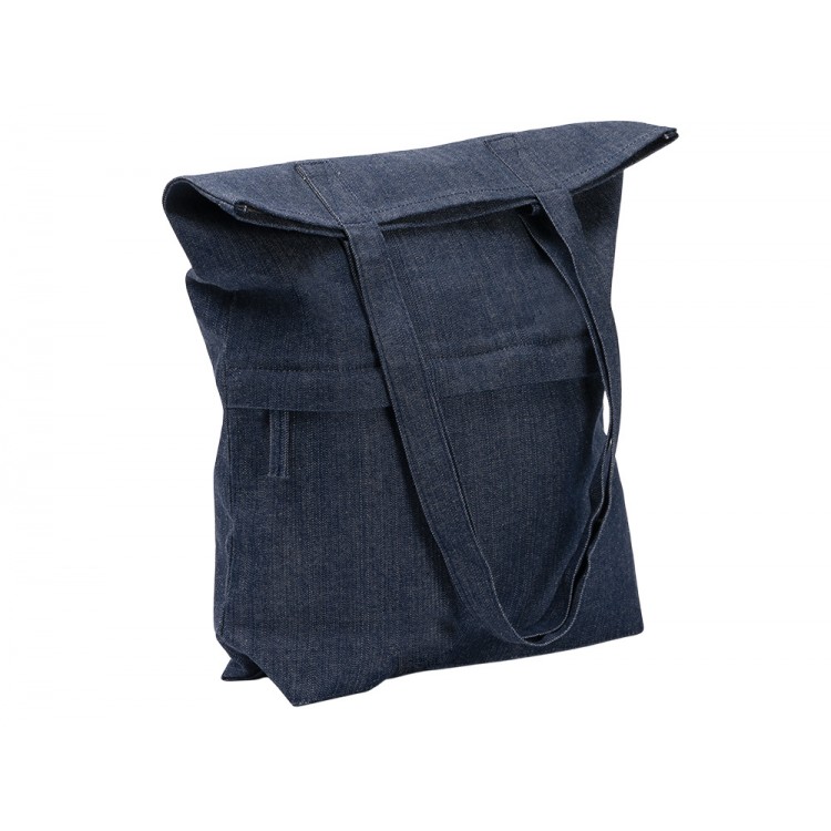 Сумка из переработанной джинсовой ткани с передним карманом на застежке. Высота ручек 29 см.